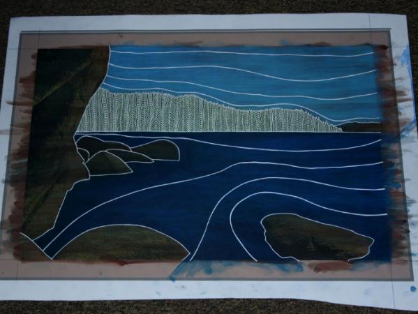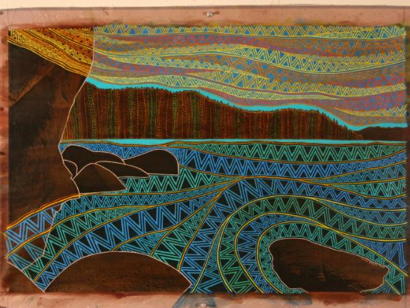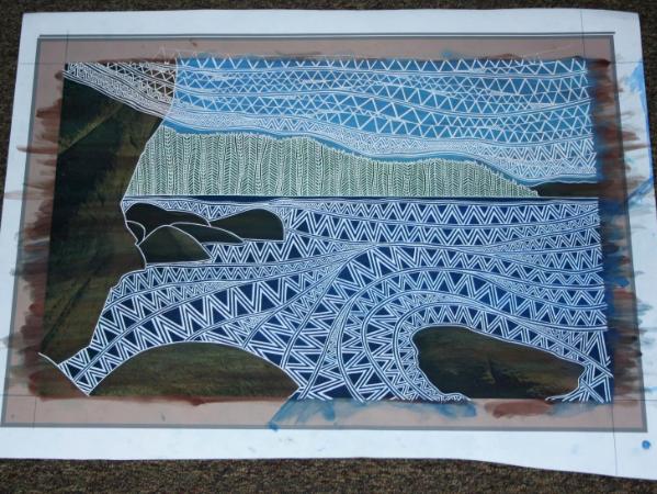 This is the edited photographic image which was printed on canvas. Then I added color and etched design into the face. Then I added more color.